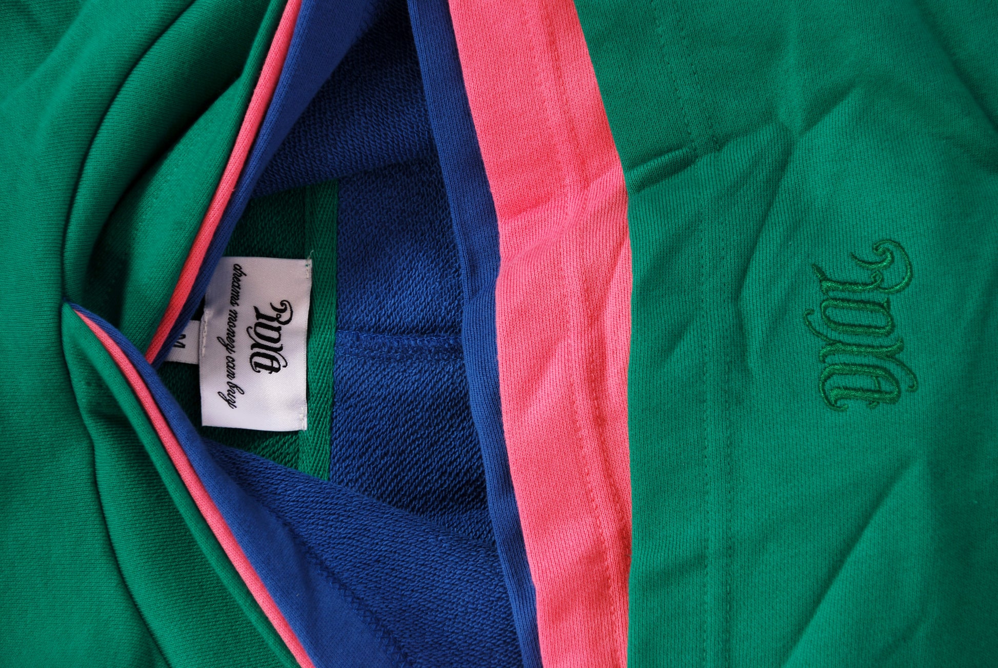The triple hoodie is a multilayeredgarment with 3 different very vibrant colors. making it look like a person may have three different hoodies on.